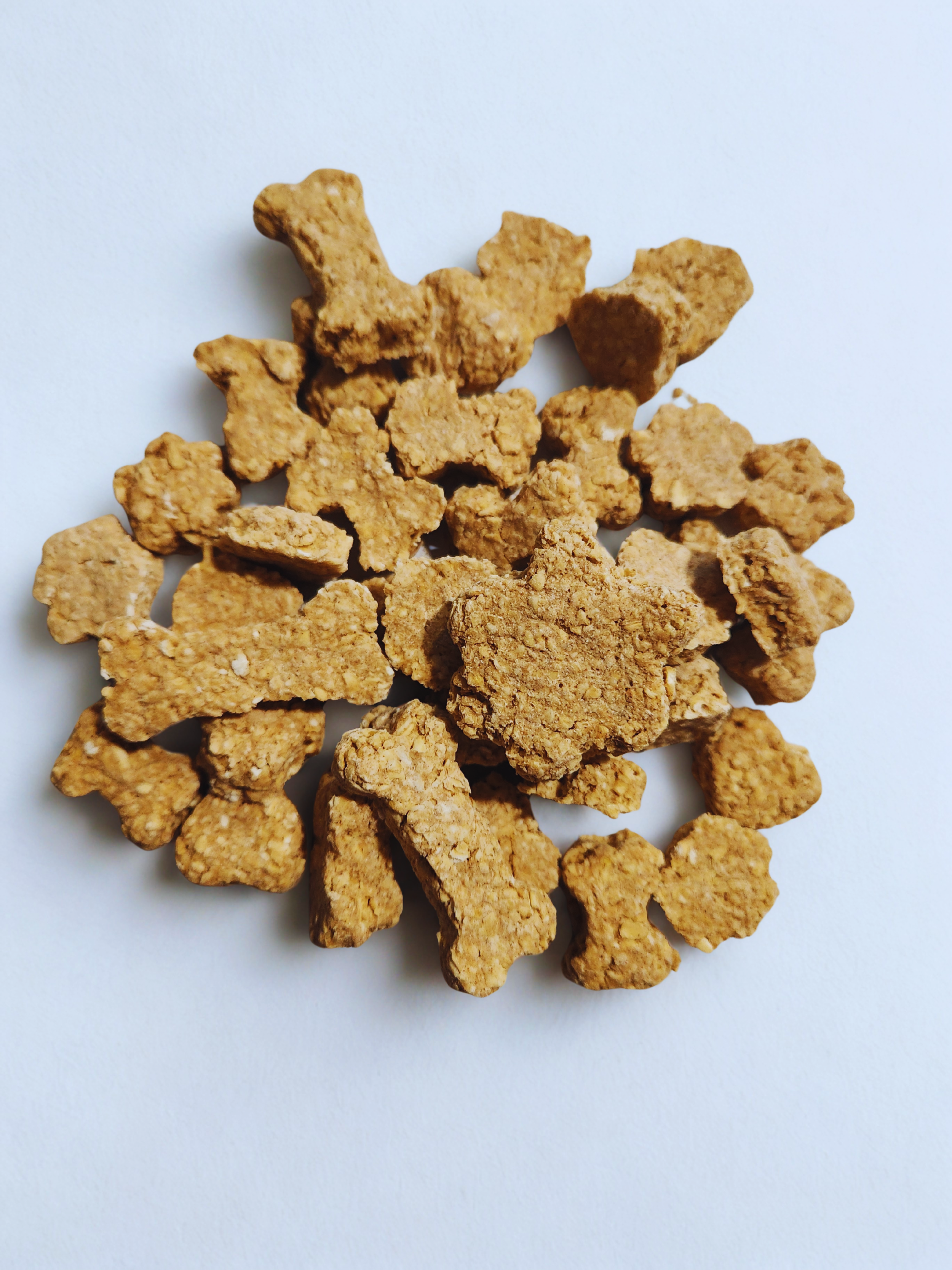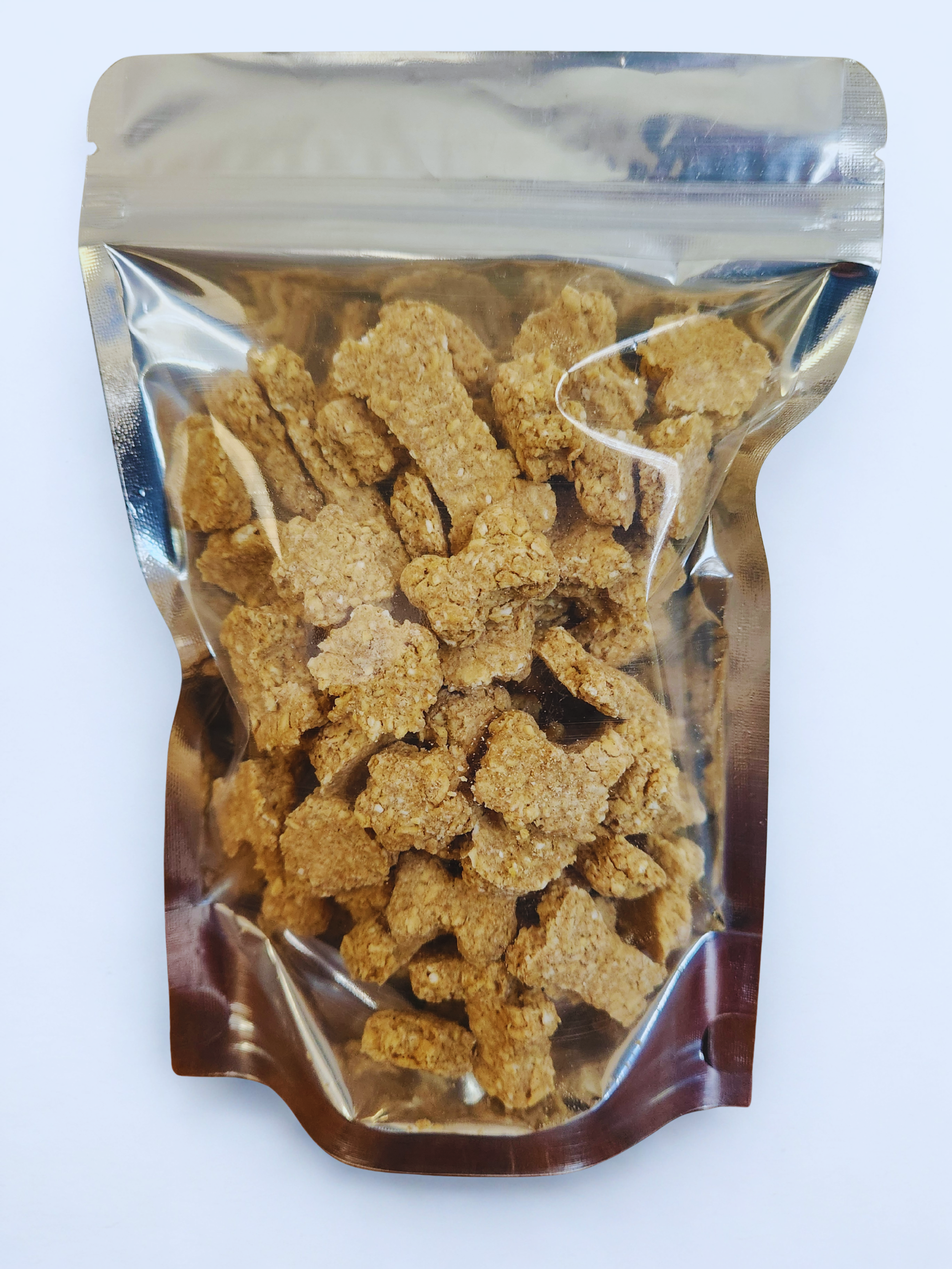 Oat flour, pure pumpkin, ground flax seed, beef bone broth, cinnamon, egg, turmeric, black pepper, coconut oil